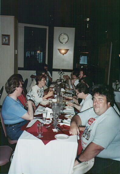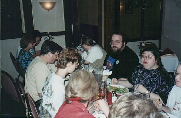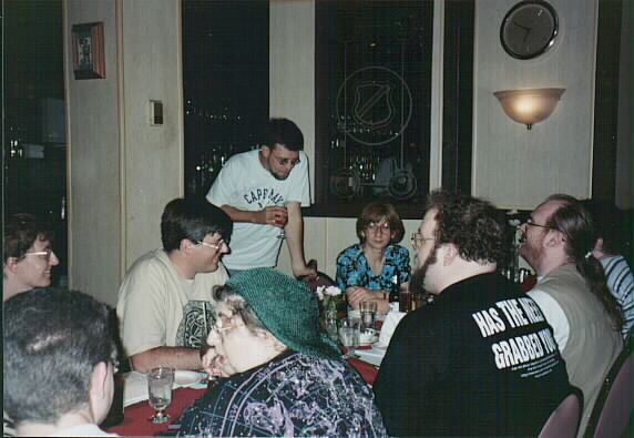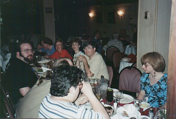 Complete table. Left side of table, from front: Duncan MacGregor, Alayne MacGregor (obscured), Ellen Blackburn, Adam Ek (obscured), Franz Tomasek (absent from seat, behind camera!), Tasia Papadatos (obscured), Doug Muir (obscured). Right side of table, from the front: Eric Oppen, Marty Adkins (obscured), Jerrie Adkins, Debra Fran Baker (obscured), Tony Zbaraschuk, Michael Bernardi, Emily D (obscured). Eight place settings on the left, seven on the right?